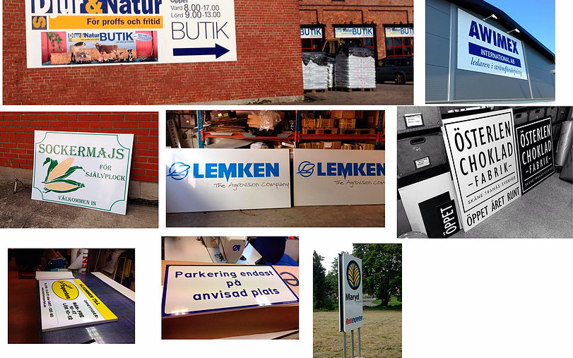 Skyltar gör vi i alla former och material. Vanliga material är plast i dimension 3,5 eller 10 mm. Dessa finns i olika format och lämpar sig väl för utomhusmontering då de inte drar till sig fukt och vatten.